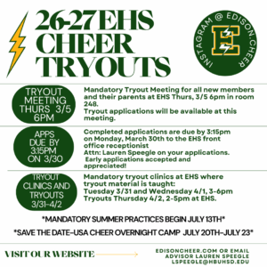 Tryout Clinics (where the tryout material is taught), Tuesday and Wednesday March 31/April 1; 3:00-6pm at EHS. Wear athletic clothing, athletic shoes, hair must be pulled back and no jewelry of any kind.